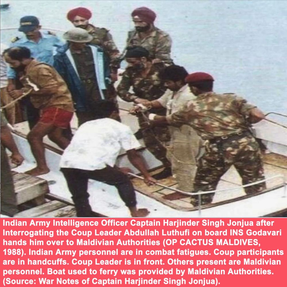 After interrogation on INS Godavari Capt. Harjinder Singh Jonjua Indian Army Int Offr hands Coup Leader to local Authorities.